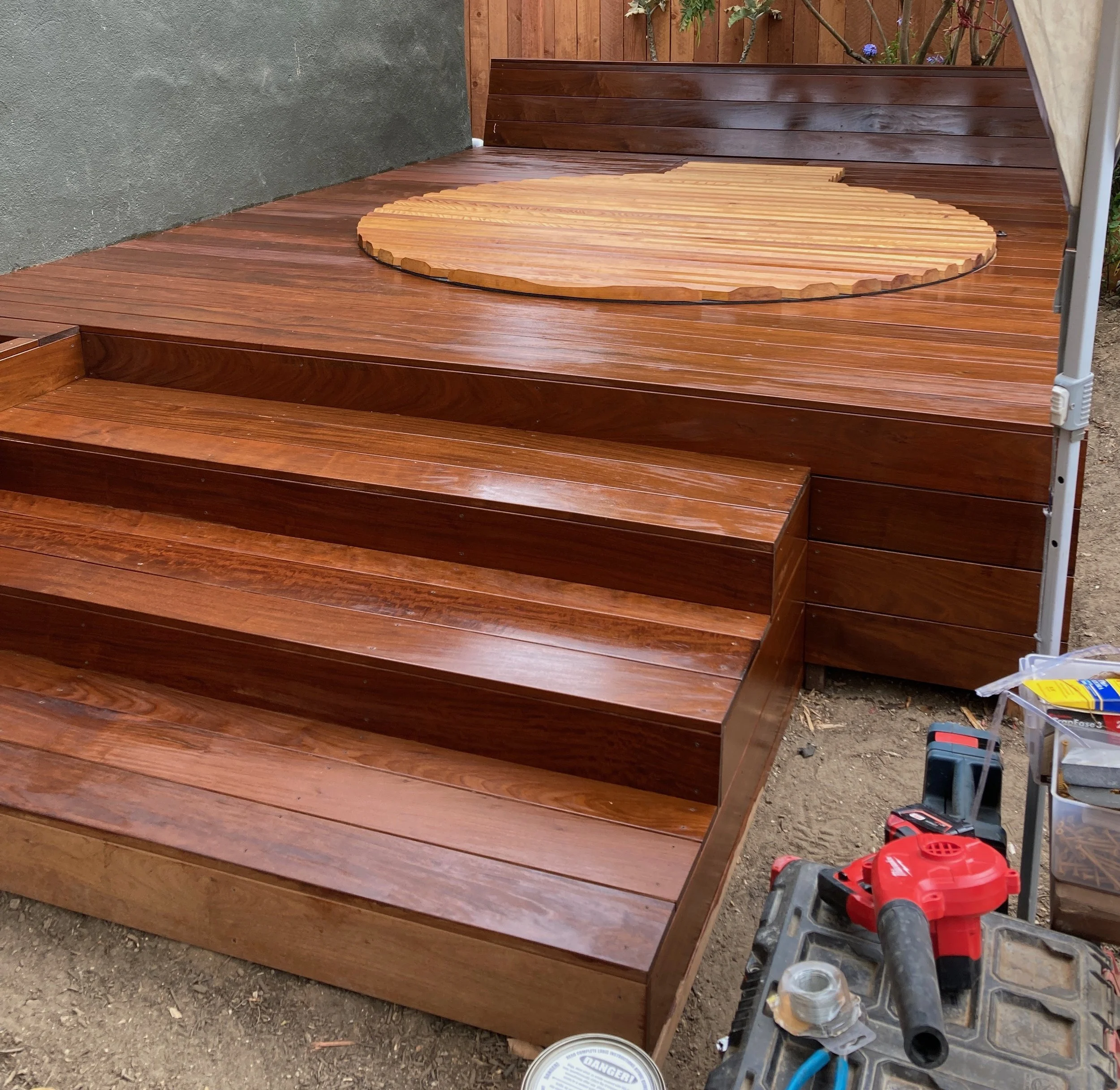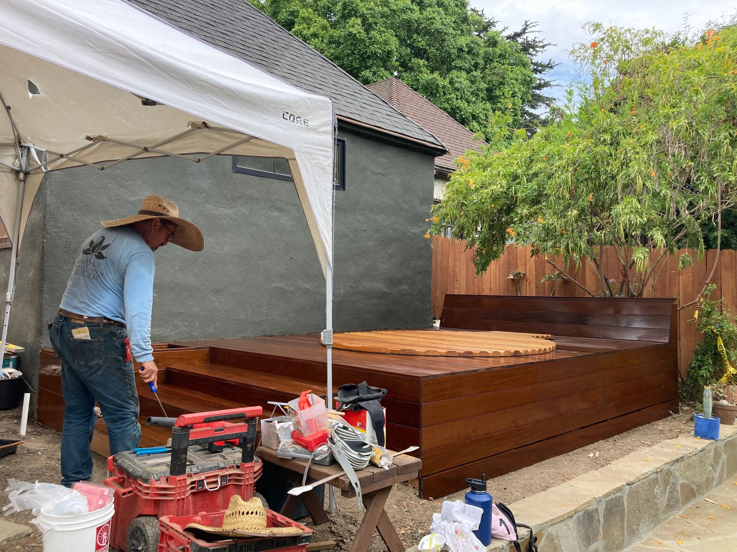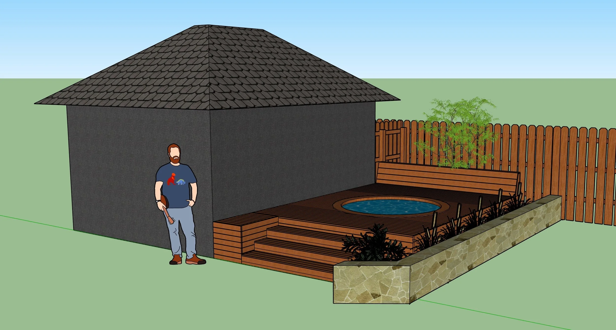 Illustration of a backyard featuring a wooden deck with a circular pool, a person standing near a dark house, a fence, and some plants.