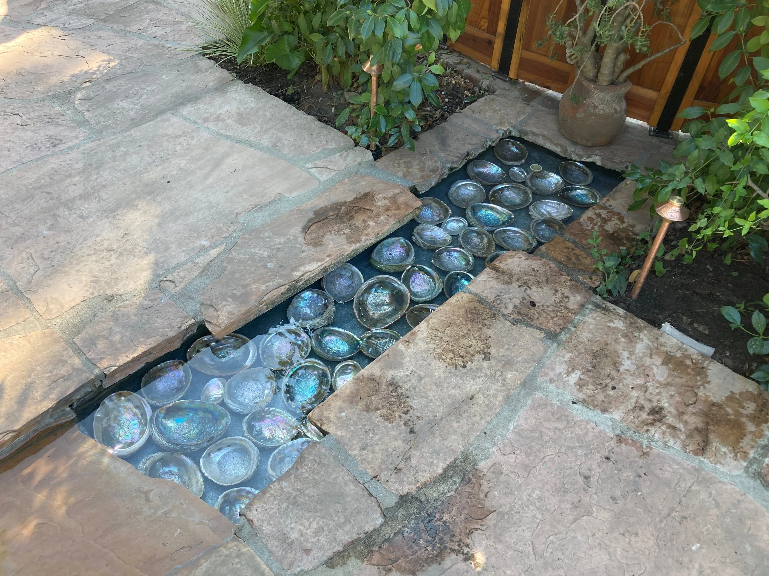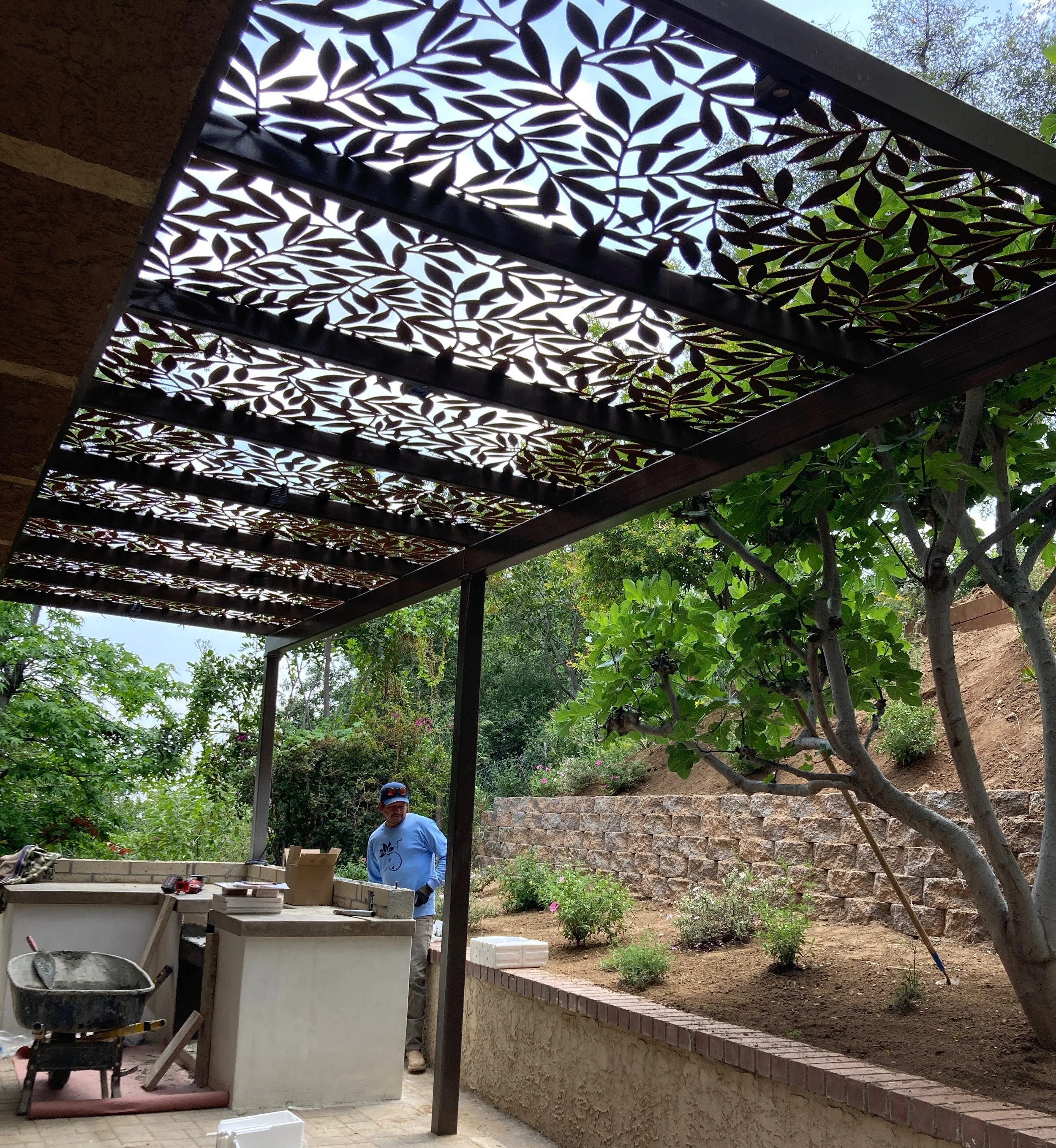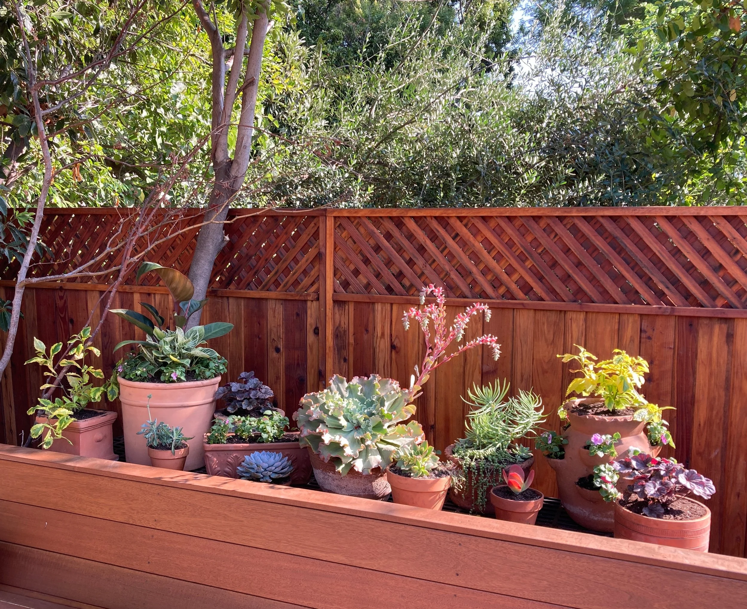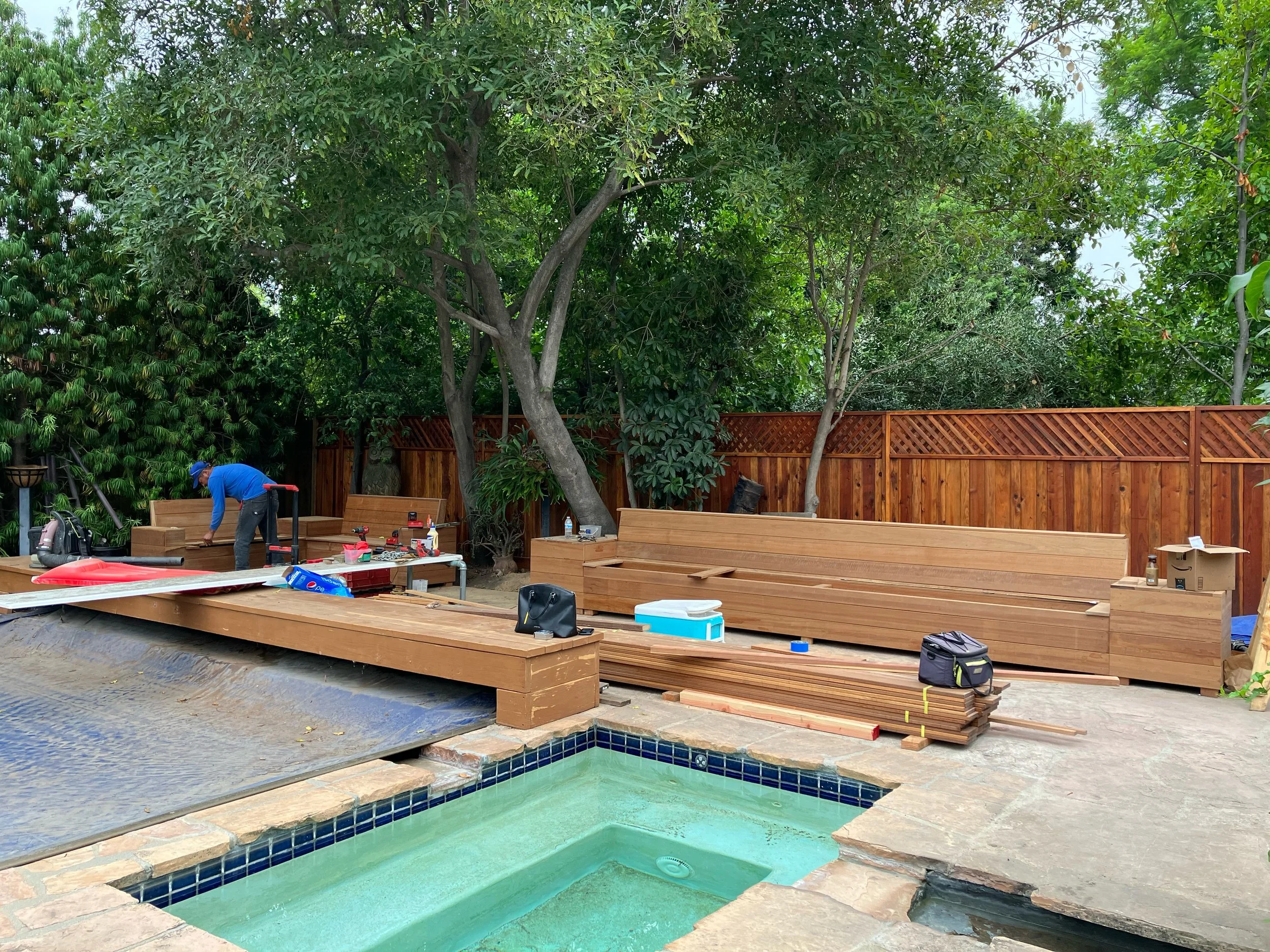 Illustration of a backyard featuring a wooden deck with a circular pool, a person standing near a dark house, a fence, and some plants.